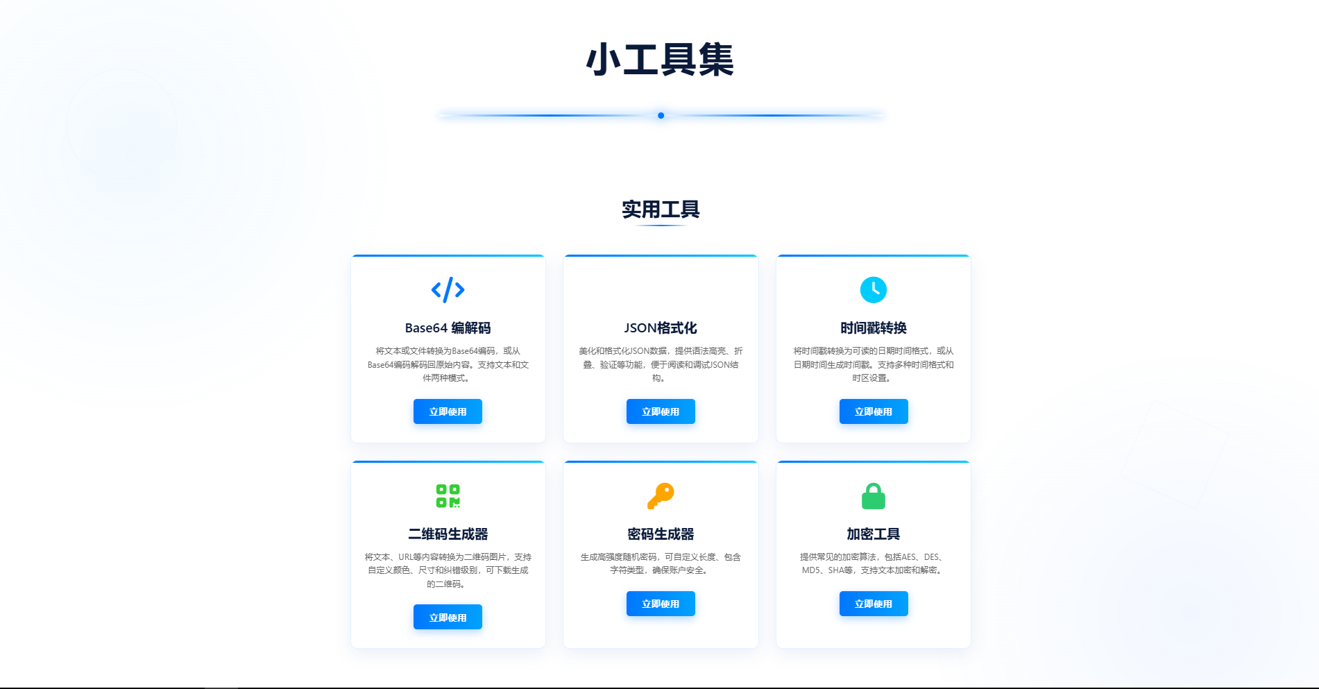 We have created a tool collection website. Currently, the website tools include "Base64 Encoder/Decoder", "JSON Formatter", "Timestamp Converter", "QR Code Generator", "Password Generator", and "Text Encryption".